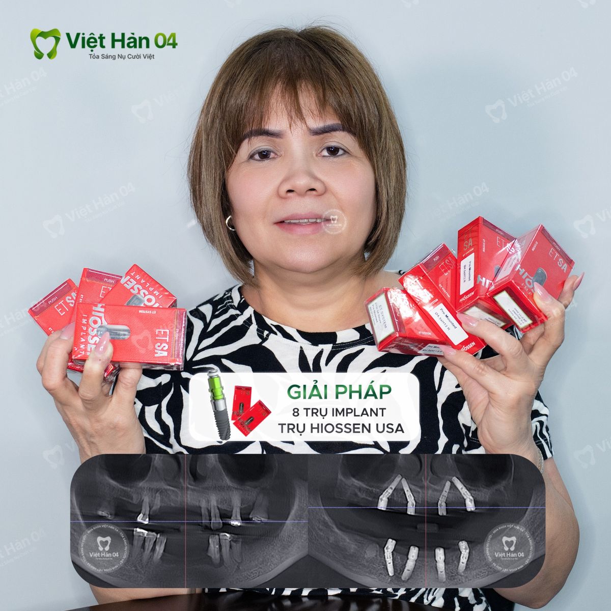 - Giải pháp: Implant toàn hàm All On 4 với 8 trụ Hiossen, áp dụng công nghệ máng định vị