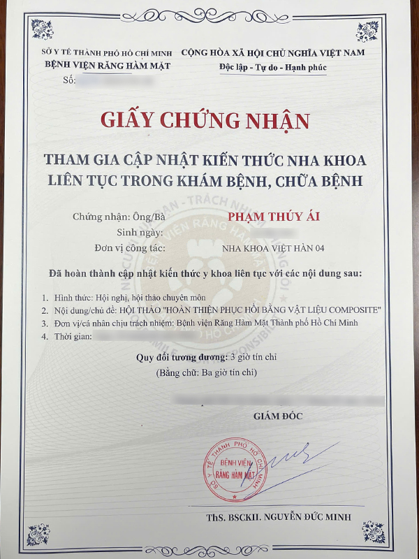 Khách hàng luôn an tâm điều trị tại Nha khoa Việt Hàn 04 bởi bác sĩ Huy Khánh đã có nhiều năm kinh nghiệm và có đầy đủ bằng cấp cũng như chứng chỉ hành nghề: