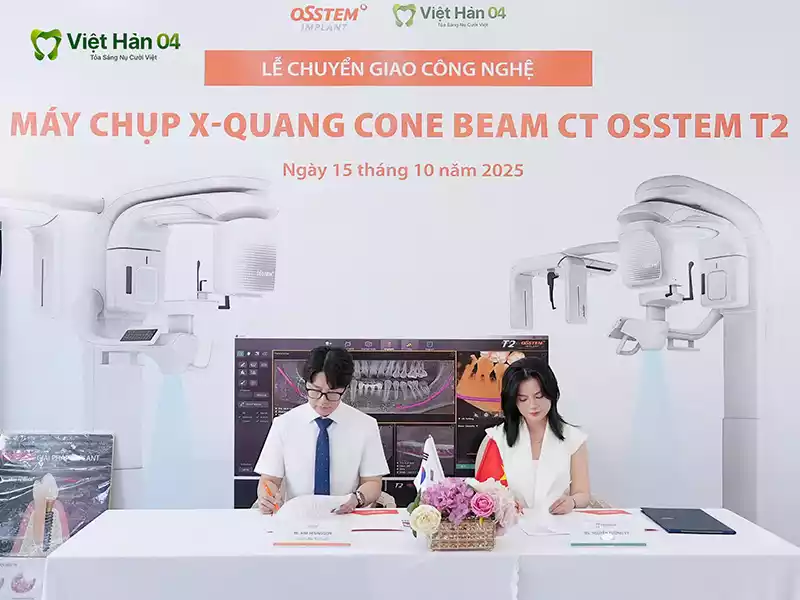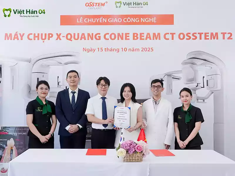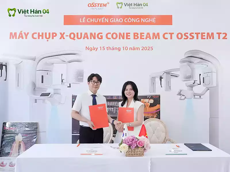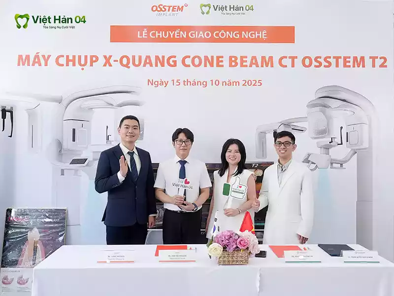 Sáng ngày 15/10/2025, tại Nha khoa Việt Hàn 04 - chi nhánh Nguyễn Văn Cừ, đại diện hãng Osstem là Mr.Kim Heunggon và Mr. Jung Woobin cùng các đại diện Nha khoa Việt Hàn 04 đã tiến hành ký kết chuyển giao công nghệ tiên tiến máy CTCB T2 để ứng dụng trong việc chẩn đoán tình trạng răng của khách hàng thông qua phim chụp X-quang, góp phần đưa ra kế hoạch trong điều trị chuẩn xác nhất.